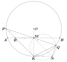 В окружности с центром O проведена хорда AB и радиус OK, пересекающий её под прямым углом в точке M. На большей дуге AB окружности выбрана точка P, отличная от середины этой дуги. Прямая PM вторично пересекает окружность в точке Q, а прямая PK пересекает AB в точке R. Докажите, что KR > MQ.