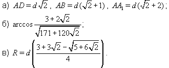 В прямоугольном параллелепипеде ABCDA1B1C1D1 четыре числа – длины рёбер и диагонали AC1 – образуют арифметическую прогрессию с положительной разностью d, причём AD < AB < AA1. Две внешне касающиеся друг друга сферы одинакового неизвестного радиуса R расположены так, что их центры лежат внутри параллелепипеда, причём первая сфера касается граней ABB1A1, ADD1A1, ABCD, а вторая – граней BCC1B1, CDD1C1, A1B1C1D1. Найдите: а) длины рёбер параллелепипеда; б) угол между прямыми CD1 и AC1; в) радиус R.