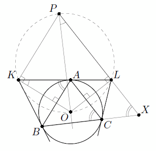 ∠KAB = ∠ACB = ∠PXB. Таким образом, ∠OPX + ∠PXB = ∠OKL + ∠KAB = 90°, то есть точка P лежит на серединном перпендикуляре к отрезку BC.
