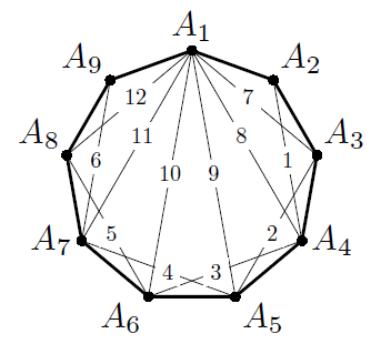 Докажем, что в выпуклом n-угольнике A1A2...An максимальное количество диагоналей, которое можно провести указанным способом, равно 2n – 6. Петя может провести последовательно диагонали A2A4, A3A5, A4A6, ..., An–2An, а затем – диагонали A1A3, A1A4, A1A5, ..., A1An–1; итого 2n – 6 диагоналей. На рисунке приведён пример для n = 9.