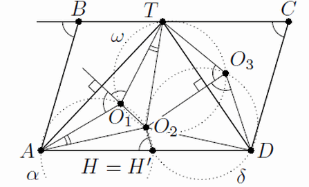 Треугольники O1TO1 и O1AO2 симметричны относительно прямой O1O2. Значит, описанная окружность α треугольника AO1O2 равна ω. Аналогично описанная окружность δ треугольника DO2O3 также равна ω.