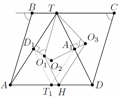 Обозначим через A1, D1 и T1 середины сторон DT, AT и AD треугольника ADT, а через α, δ, τ – его углы при вершинах A, D, T соответственно. Тогда ∠TO1D1 = 180° – ∠ABC = ∠BCD = ∠TO3A1. Значит, прямоугольные треугольники TO1D1 и TO3A1 подобны, и