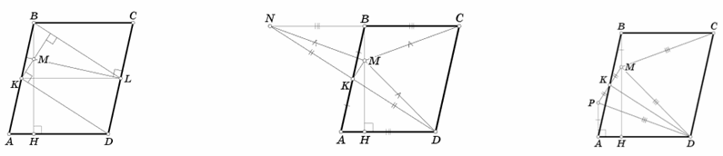 Решение 2:Пусть N – точка пересечения прямых DK и BC (рис. в центре). Треугольники KAD и KBN равны по второму признаку. Отсюда NB = BC, и BM является серединным перпендикуляром к отрезку CN. Значит, точка M равноудалена от точек N, C и D, то есть является центром описанной окружности треугольника NCD. Поэтому MK ⊥ ND.