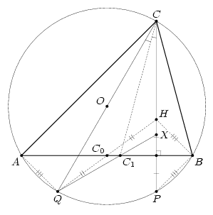 2) Построим окружность, проходящую через точки W, P и Q. Найдём точки A и B её пересечения с прямой C0C1 и точку C её пересечения с прямой PH. Треугольник ABC искомый. Третий способ. 1) Построим точку X пересечения прямых QC1 и HP (рис. справа).