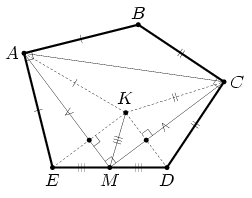 Пусть M – середина стороны DE. Тогда MK = ME, и значит, треугольники AKM и AEM равны. По той же причине равны треугольники CKM и CDM. Поэтому SABCDE = 2SAMC.