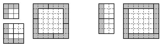 Решение 1:Так как равна нулю сумма и в квадратике 3×3, и во входящем него квадрате 2×2, то равна нулю и сумма в остающемся уголке из 5 клеток. По аналогичной причине равна нулю сумма чисел в уголке из 7 клеток, получающемся выкидыванием из квадрата 4×4 (то есть четырёх квадратов 2×2) квадрата 3×3. Осталось заметить, что из уголков двух таких видов можно составить рамку квадрата 7×7 (рис. слева).