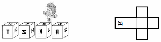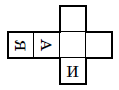Посмотрим на первый кубик справа и нарисуем на развёртке буквы А и И (рис. слева). Затем посмотрим на второй кубик и нарисуем на развёртке буквы К и Т (рис. справа). И, наконец, посмотрев на третий кубик, нарисуем букву Н. Проверим, что четвёртый кубик действительно соответствует нашей развёртке.