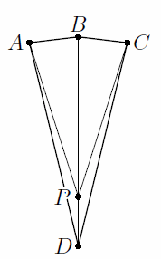 Пусть в четырёхугольнике ABCD AD = BD = CD = x, AB = BC = y < x/4, а P – такая точка на диагонали BD, что PD = y (см. рис.). Тогда
