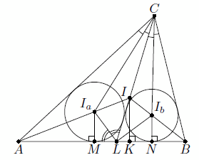Итак, мы можем последовательно построить точку K, затем I (как пересечение окружности с центром L и перпендикуляра к MN в точке K), Ia и Ib (как пересечение биссектрис углов ALI и CLI с перпендикулярами к отрезку MN в его концах), окружности wa и wb и, наконец, точки C (как пересечение касательных к wa из A и L) и B (как пересечение MN с касательной к wb из точки C).