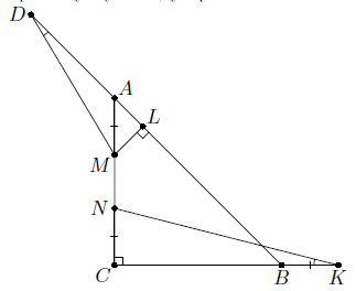ABC – равнобедренный прямоугольный треугольник. На продолжении гипотенузы AB за точку A взята точка D так, что AB = 2AD. Точки M и N на стороне AC таковы, что AM = NC. На продолжении стороны CB за точку B взята такая точка K, что CN = BK. Найдите угол между прямыми NK и DM.