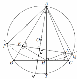Первый способ.Пусть D и N – точки пересечения AO с KL и Ω соответственно, а r – радиус Ω. Из прямоугольного треугольника AQN AQ² = 2r·AD. Заметим, что AH – диаметр описанной окружности треугольника AKL, значит, коэффициент подобия треугольников AKL и ABC равен AH/2r. Отрезки AD и AH – соответственные высоты в этих треугольниках, поэтому AD : AH = AH : 2r, или AH² = 2r·AD = AQ².