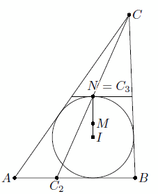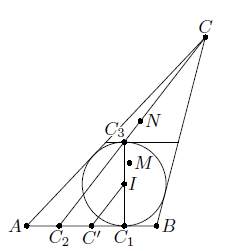 а C' – середина этой стороны. Как известно, C1C' = C2C' (см. задачу 155404). При гомотетии с центром C, переводящей ωC в ω, точка C2 переходит в точку C3 на ω, диаметрально противоположную C1 (так как касательные к ω в этих точках параллельны; рис. слева). Значит, IC' – средняя линия треугольника C1C2C3, поэтому C'I || CC2. При гомотетии с центром M и коэффициентом –2 точка C' переходит в C, прямая IC' – в параллельную ей прямую СC2, проходящую через C; следовательно, точка I переходит в точку N, лежащую на CC2 (аналогично N лежит на отрезках, соединяющих другие вершины с соответствующими точками касания вневписанных окружностей; точка N называется точкой Нагеля треугольника ABC). Значит, N получается из M гомотетией с центром I и коэффициентом 3.