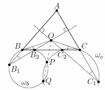 Пусть AB < BC; тогда точка B2 лежит на стороне BC, а B1 – на продолжении стороны AB за точку B. Имеем ∠B2B1A = ∠OB1A = 90° – ∠A. С другой стороны, ∠B2BO = ∠CBO = 90° – ½ ∠BOC = 90° – ∠A. Таким образом, вписанный угол B2B1B равен углу между секущей BB2 и прямой OB. Следовательно, OB касается ωb.