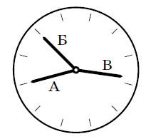 (Стрелки А и Б на рисунке смотрят ровно на часовые отметки, а стрелка В чуть-чуть не дошла до часовой отметки.)