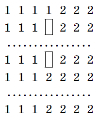 Если в какой-то столбец начали попадать и единицы, и двойки, то все остальные столбцы уже заполнены: слева – единицами, справа – двойками. Значит, будет максимум один столбец, куда попадут и единицы, и двойки. Поэтому если номера и отличаются, то только цифрой в этом столбце. Но так как цифр только две, то и разных номеров не больше двух.