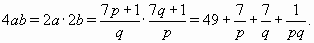 Итак, a = 1, b = 13, 7p + 1 = 2q, 7q + 1 = 26p. Отсюда 49p + 7 = 14q = 52p – 2, так что p = 9 : 3 = 3, q = (7·3 + 1) : 2 = 11.
