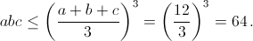 В обоих случаях равенство достигается, если a = b = c = 4. Следовательно, наибольшее значение данного выражения равно 64 + 144 : 3 = 112. Второй способ. Пусть X = ab + bc + ac + abc. Тогда