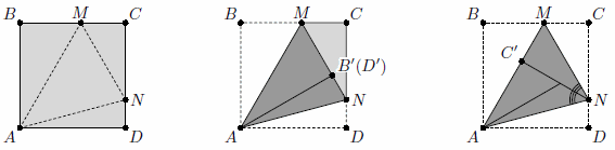 Разогнём бумагу и отметим равные углы, которые были совмещены при сгибании (пунктирные линии на рисунке – стороны исходного квадрата ABCD, которые ранее совмещались). Угол MAN составляет половину прямого угла BAD, то есть равен 45°. Три равных угла с вершиной M вместе образуют развёрнутый угол, поэтому ∠AMN = 60°. Значит, ∠ANM = 180 – 45° – 60° = 75°.
