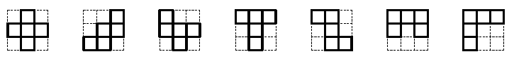 Из каждого клетчатого квадрата со стороной 3 клетки вырезается фигура из пяти клеток с таким же периметром, как у квадрата, но площадью 5 клеток. Саша утверждает, что сможет вырезать семь таких различных фигур (никакие две из них не совместятся при наложении, даже если фигуры переворачивать). Не ошибается ли он?