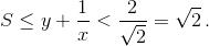 x, y > 0. Через S обозначим наименьшее из чисел x, 1/y, y + 1/x. Какое максимальное значение может принимать величина S?
