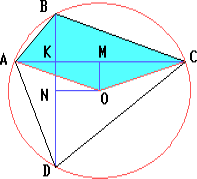 Решение 1:Пусть K – точка пересечения диагоналей AC и BD. Если O принадлежит AC, то решение очевидно. Иначе, один из получившихся четырёхугольников – выпуклый. Пусть тогда M и N – основания перпендикуляров, опущенных из точки O на AC и BD. Тогда