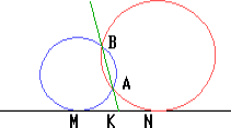 Пусть A и B — точки пересечения двух окружностей, MN — общая касательная (M и N — точки касания), K — точка пересечения прямых AB и MN (A между K и B). Тогда
