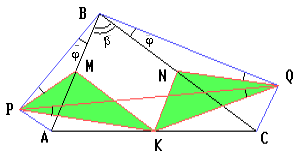 ∠PKQ = ∠PKM + ∠MKN + ∠NKQ = β + ∠PKM + ∠NKQ = β + ∠PKM + ∠MPK = β + 180° – ∠PMK = β + 180° – (β + 2φ) = 180° – 2φ, ∠QPK = ∠PQK = φ.