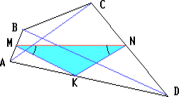 Пусть M, N и K – середины сторон AB, CD и AD четырёхугольника ABCD, причём прямая MN образует равные углы с диагоналями.