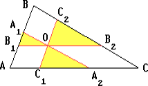 Пусть O – произвольная точка, взятая внутри треугольника ABC; A1A2 || BC, B1B2 || AC, C1C2 || AB (см. рис.). Обозначим A2C = OB2 = x, A2C1 = y,