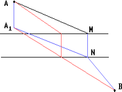 В каком месте следует построить мост MN через реку, разделяющую две данные деревни A и B, чтобы путь AMNB из деревни A в деревню B был кратчайшим (берега реки считаются параллельными прямыми, мост предполагается перпендикулярным к реке).