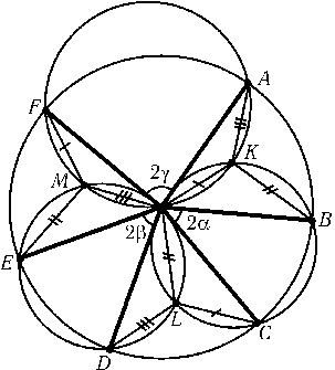 Пусть K, L, M – точки пересечения описанных окружностей треугольников FOA и BOC, BOC и DOE, DOE и FOA; 2α, 2β и 2γ – углы при вершинах равнобедренных треугольников BOC, DOE и FOA (см. рис.). Точка K лежит на дуге OB описанной окружности равнобедренного треугольника BOC, поэтому ∠OKB = 180° – ∠OCB = 90° + α. Аналогично ∠OKA = 90° + γ. Так как α + β + γ = 90°, то ∠AKB = 90° + β. Внутри правильного треугольника AOB существует единственная точка K, из которой его стороны видны под данными углами. Аналогичные рассуждения для точки L, лежащей внутри треугольника COD, показывают, что треугольники OKB и CLO равны.