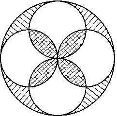В круге проведены два перпендикулярных диаметра, т. е. четыре радиуса, а затем построены четыре круга, диаметрами которых служат эти радиусы. Докажите, что суммарная площадь попарно общих частей этих кругов равна площади части исходного круга, лежащей вне рассматриваемых четырех кругов (рис.).