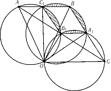Обозначим точки пересечения окружностей, построенных на отрезках OBи OC, OAи OC, OAи OB, через A1,B1,C1соответственно (рис.). $\angle$OA1B=$\angle$OA1C= 90o, поэтому точки B,A1и Cлежат на одной прямой, а так как окружности имеют одинаковые радиусы, то BA1=A1C. Точки A1,B1,C1являются серединами сторон треугольника ABC, поэтому BA1=C1B1и BC1=A1B1. Так как круги имеют одинаковый радиус, то равные хорды BA1и C1B1отсекают от кругов части равной площади, а равные хорды C1Bи B1A1также отсекают от кругов части равной площади. Поэтому площадь криволинейного треугольника A1B1C1равна площади параллелограмма A1B1C1B, т. е. равна половине площади треугольника ABC.