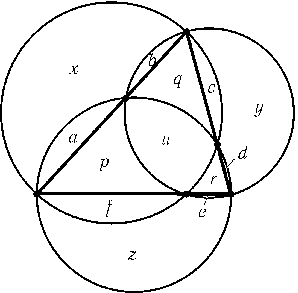 Рассматриваемые окружности проходят через основания высот треугольника, а значит, точки их пересечения лежат на сторонах треугольника. Пусть x,y,zи u — площади рассматриваемых криволинейных треугольников; a,b,c,d,eи f — площади сегментов, отсекаемых от окружностей сторонами треугольника; p,qи r — площади частей треугольника, лежащих вне внутреннего криволинейного треугольника (рис.). Тогда x+ (a+b) =u+p+q+ (c+f),y+ (c+d)=u+q+r+ (e+b) и z+ (e+f)=u+r+p+ (a+d). Складывая эти равенства, получаем x+y+z= 2(p+q+r+u) +u.