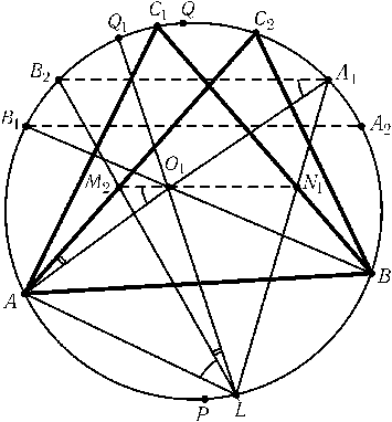 Решение этой задачи обобщает решение предыдущей задачи. Достаточно доказать, что центр O1вписанной окружности треугольника ABC1лежит на отрезке M2N1. Пусть A1и A2 — середины дуг BC1и BC2, B1и B2 — середины дуг AC1и AC2; PQ — диаметр окружности S, перпендикулярный хорде AB, причем Qи C1лежат по одну сторону от прямой AB. Точка O1является точкой пересечения хорд AA1и BB1, а точка Lкасания окружностей Sи S1является точкой пересечения прямых A1N1и B2M2(рис.). Пусть $\angle$C1AB= 2$\alpha$,$\angle$C1BA= 2$\beta$,$\angle$C1AC2= 2$\varphi$. Тогда $\smile$A1A2= 2$\varphi$=$\smile$B1B2, т. е. A1B2||B1A2. Угол между хордами A1B2и BC1равен ($\smile$B2C1+$\smile$A1B)/2 =$\beta$-$\varphi$+$\alpha$, а угол между хордами BC1и AC2равен ($\smile$C1C2+$\smile$AB)/2 = 2$\varphi$+ 180o- 2$\alpha$- 2$\beta$. Поэтому хорда M2N1образует с касательными BC1и AC2равные углы $\alpha$+$\beta$-$\varphi$, а значит, M2N1||A1B2. Предположим теперь, что точки M2' и N1' перемещаются по хордам AC2и BC1так, что M2'N1' ||A1B2. Пусть прямые A1N1' и B2M2' пересекаются в точке L'. Точка L'лежит на окружности Sлишь при одном положении точек M2' и N1'. Поэтому достаточно указать на дуге ABтакую точку L1, что если M2'',N1'' — точки пересечения хорд AC2и L1B2, BC1и L1A1, то M2''N1'' ||A1B2и точка O1лежит на отрезке M2''N1''. Пусть Q1 — такая точка окружности S, что 2$\angle$(PQ,PQ1) =$\angle$(PC2,PC1), и L1 — точка пересечения прямой Q1O1с окружностью S. Докажем, что точка L1искомая. Так как $\smile$B1Q= 2$\alpha$, то $\smile$B2Q1= 2($\alpha$- 2$\varphi$) =$\smile$C2A1. Поэтому четырехугольник AM2''O1L1вписанный, а значит, $\angle$M2''O1A=$\angle$M2''L1A=$\angle$B2A1A, т. е. M2''O1||B2A1. Аналогично N1''O1||B2A1.