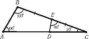 В треугольнике ABCточка E — середина стороны BC, точка Dлежит на стороне AC,AC= 1,$\angle$BAC= 60o,$\angle$ABC= 100o,$\angle$ACB= 20oи $\angle$DEC= 80o(рис.). Чему равна сумма площади треугольника ABCи удвоенной площади треугольника CDE?