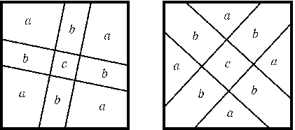 Пусть данные прямые l1и l2делят квадрат на четыре части, площади которых равны S1,S2,S3и S4, причем для первой прямой площади частей, на которые она делит квадрат, равны S1+S2и S3+S4а для второй они равны S2+S3и S1+S4. Так как по условию S1=S2=S3, то S1+S2=S2+S3. Это означает, что образ прямой l1при повороте относительно центра квадрата на +90oили -90oне просто параллелен прямой l2, а совпадает с ней. Остается доказать, что прямая l1(а значит, и прямая l2) проходит через центр квадрата. Предположим, что это не верно. Рассмотрим образы прямых l1и l2при поворотах на ±90oи обозначим площади частей, на которые они делят квадрат, так, как показано на рис. (на этом рисунке изображены оба различных варианта расположения прямых). Прямые l1и l2делят квадрат на четыре части, площади которых равны a,a+b,a+ 2b+cи a+b, причем числа a,bи cненулевые. Ясно, что три из указанных четырех чисел не могут быть равны. Получено противоречие.