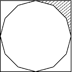 а) Четыре вершины правильного двенадцатиугольника расположены в серединах сторон квадрата (рис.). Докажите, что площадь заштрихованной части в 12 раз меньше площади двенадцатиугольника. б) Докажите, что площадь двенадцатиугольника, вписанного в окружность радиуса 1, равна 3.