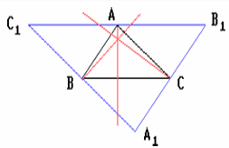 Первый способ. а) Проведём через вершины треугольника ABC прямые, параллельные его противоположным сторонам. В результате получим треугольник A1B1C1, серединами сторон которого являются точки A, B и C. Высоты треугольника ABC являются серединными перпендикулярами к сторонам треугольника A1B1C1, поэтому центр описанной окружности треугольника A1B1C1 является точкой пересечения высот треугольника ABC.