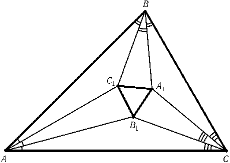 В треугольникеABCпроведены триссектрисы (лучи, делящие углы на три равные части). Ближайшие к сторонеBCтриссектрисы угловBиCпересекаются в точкеA1; аналогично определим точкиB1иC1(см. рис.). Докажите, что треугольник A1B1C1равносторонний.