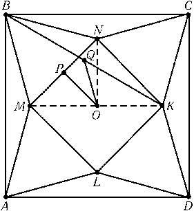 Треугольник BMC равнобедренный с углом при вершине 30° и углом при основании 75°. Следовательно, треугольники BAM и BCN равнобедренные с углом 15° при основании. Поэтому треугольник BMN правильный. Пусть O – центр квадрата, P и Q – середины отрезков MN и BK (см. рис.). Так как OQ – средняя линия треугольника MBK, то OQ = 1/2 BM = MP = OP и ∠QON = ∠MBA = 15°, а значит, ∠POQ = ∠PON – ∠QON = 30°.