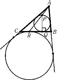 Предположим, что искомый треугольник ABCпостроен. Пусть Q — точка касания вписанной окружности со стороной BC, PQ — диаметр этой окружности, R — точка касания вневписанной окружности со стороной BC. Ясно, что BR= (a+b+c)/2 -c= (a+b-c)/2 и BQ= (a+c-b)/2. Поэтому RQ= |BR-BQ| = |b-c|. Вписанная окружность треугольника ABCи вневписанная окружность, касающаяся стороны BC, гомотетичны с центром гомотетии A. Поэтому точка Aлежит на прямой PR(рис.). Из этого вытекает следующее построение. Строим прямоугольный треугольник PQRпо известным катетам PQ= 2rи RQ= |b-c|. Затем проводим две прямые, параллельные прямой RQи удаленные от нее на расстояние ha. Вершина Aявляется точкой пересечения одной из этих прямых с лучом RP. Так как длина диаметра PQвписанной окружности известна, ее можно построить. Точки пересечения касательных к этой окружности, проведенных из точки A, с прямой RQявляются вершинами Bи Cтреугольника.