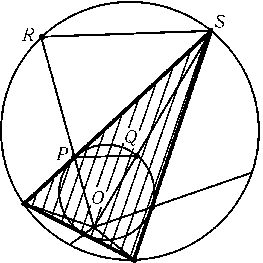 Пусть O — центр гомотетии, переводящей вписанную окружность в описанную. Разобьем плоскость лучами, выходящими из точки Oи проходящими через вершины многоугольника и точки касания его сторон с вписанной окружностью (рис.). Достаточно доказать требуемое неравенство для частей кругов и многоугольника, заключенных внутри каждого из образованных этими лучами углов. Пусть стороны угла пересекают вписанную и описанную окружности в точках P,Qи R,Sсоответственно, причем P — точка касания, а S — вершина многоугольника. Площади частей кругов больше площадей треугольников OPQи ORS, поэтому достаточно доказать, что 2SOPS$\leq$SOPQ+SORS. Так как 2SOPS= 2SOPQ+ 2SPQSи SORS=SOPQ+SPQS+SPRS, остается доказать, что SPQS$\leq$SPRS. Это неравенство очевидно, так как высоты треугольников PQSи PRS, опущенные на основания PQи RS, равны, a PQ<RS.