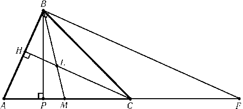 Проведем через точку Bперпендикуляр к стороне AB. Пусть F — точка пересечения этого перпендикуляра с продолжением стороны AC(рис.). Докажем, что биссектриса AD, медиана BMи высота CHпересекаются в одной точке тогда и только тогда, когда AB=CF. В самом деле, пусть L — точка пересечения BMи CH. Биссектриса ADпроходит через точку Lтогда и только тогда, когда BA:AM=BL:LM, но BL:LM=FC:CM=FC:AM.