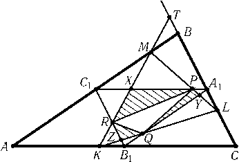 Обозначим точку пересечения прямыхKMиBCчерез T, а точки пересечения сторон треугольниковA1B1C1иKLMтак, как показано на рис. ТогдаTL:RZ=KL:KZ=LC:ZB1. Так какTL$\ge$BA1=A1C$\ge$LC, тоRZ$\ge$ZB1, т. е.SRZQ$\ge$SZB1Q. АналогичноSQYP$\ge$SYA1Pи SPXR$\ge$SXC1R. Складывая все эти неравенства и неравенствоSPQR$\ge$0, получаем, что площадь шестиугольникаPXRZQYне меньше площади оставшейся части треугольникаA1B1C1, т. е. его площадь не меньшеSA1B1C1/2 = 1/8. Равенство достигается, например, если точка Kсовпадает с B1, а точка M — с B.