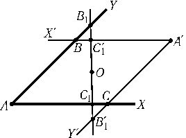 Рассмотрим уголX'A'Y', симметричный углуXAYотносительно точки O. Пусть Bи C — точки пересечения сторон этих углов. Обозначим точки пересечения прямой, проходящей через точку O, со сторонами угловXAYиX'A'Y'через B1,C1и B1',C1' соответственно (рис.). Так какSAB1C1=SA'B1'C1', тоSAB1C1= (SABA'C+SBB1C1'+SCC1B1')/2. Площадь треугольникаAB1C1минимальна, еслиB1=BиC1=C, т. е. искомой прямой являетсяBC.