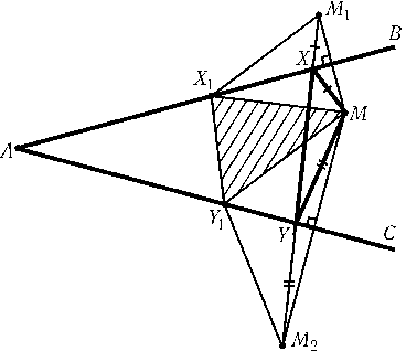 Пусть точки M1и M2симметричны Mотносительно прямыхABиAC. Так как$\angle$BAM1=$\angle$BAMи$\angle$CAM2=$\angle$CAM, то$\angle$M1AM2= 2$\angle$BAC< 180o. Поэтому отрезокM1M2пересекает лучиABиACв некоторых точках Xи Y(рис.). Докажем, что Xи Y — искомые точки. В самом деле, если точки X1и Y1лежат на лучахABиAC, тоMX1=M1X1иMY1=M2Y1, т. е. периметр треугольникаMX1Y1равен длине ломанойM1X1Y1M2. Из всех ломаных с концами в точках M1и M2наименьшую длину имеет отрезокM1M2.