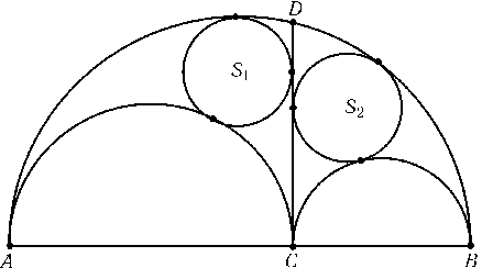 На отрезке ABвзята точка Cи на отрезках AC,BCи ABкак на диаметрах построены полуокружности, лежащие по одну сторону от прямой AB. Через точку Cпроведена прямая, перпендикулярная AB, и в образовавшиеся криволинейные треугольники ACDи BCDвписаны окружности S1и S2(рис.). Докажите, что радиусы этих окружностей равны.