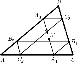 Дан треугольникABC. Точка M, расположенная внутри треугольника, движется параллельно сторонеBCдо пересечения со сторонойCA, затем параллельноABдо пересечения с BC, затем параллельноACдо пересечения с ABи т. д. Докажите, что через некоторое число шагов траектория движения точки замкнется.