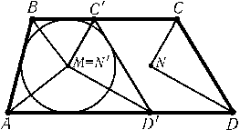 а) Достроим треугольникCBDдо параллелограммаCBDE. Тогда2KM=AE$\le$AD+DE=AD+BC, причем равенство достигается, только еслиAD|BC. б) Пустьa=AB,b=BC,c=CDи d=DA. Если|a-c| = |b-d|$\ne$0, то согласно задаче а) максимум достигается в вырожденном случае, когда все точки A,B,Cи Dокажутся на одной прямой. Предположим теперь, например, что|a-c| < |b-d|. Достроим треугольникиABLи LCDдо параллелограммовABLPи LCDQ. ТогдаPQ$\ge$|b-d|, а значит,LN2= (2LP2+ 2LQ2-PQ2)/4$\le$(2(a2+c2) - (b-d)2)/4. Кроме того, согласно задаче a)KM$\le$(b+d)/2. Оба равенства достигаются, когдаABCD — трапеция с основаниямиADи BC. Построим окружность S, касающуюся стороныABи лучейBCи AD, и перенесем треугольникCNDпараллельно (в направлении основанийBCи AD) так, чтобы точка N'совпала с точкой M, т. е. сторонаC'D'касалась окружности S(рис.).